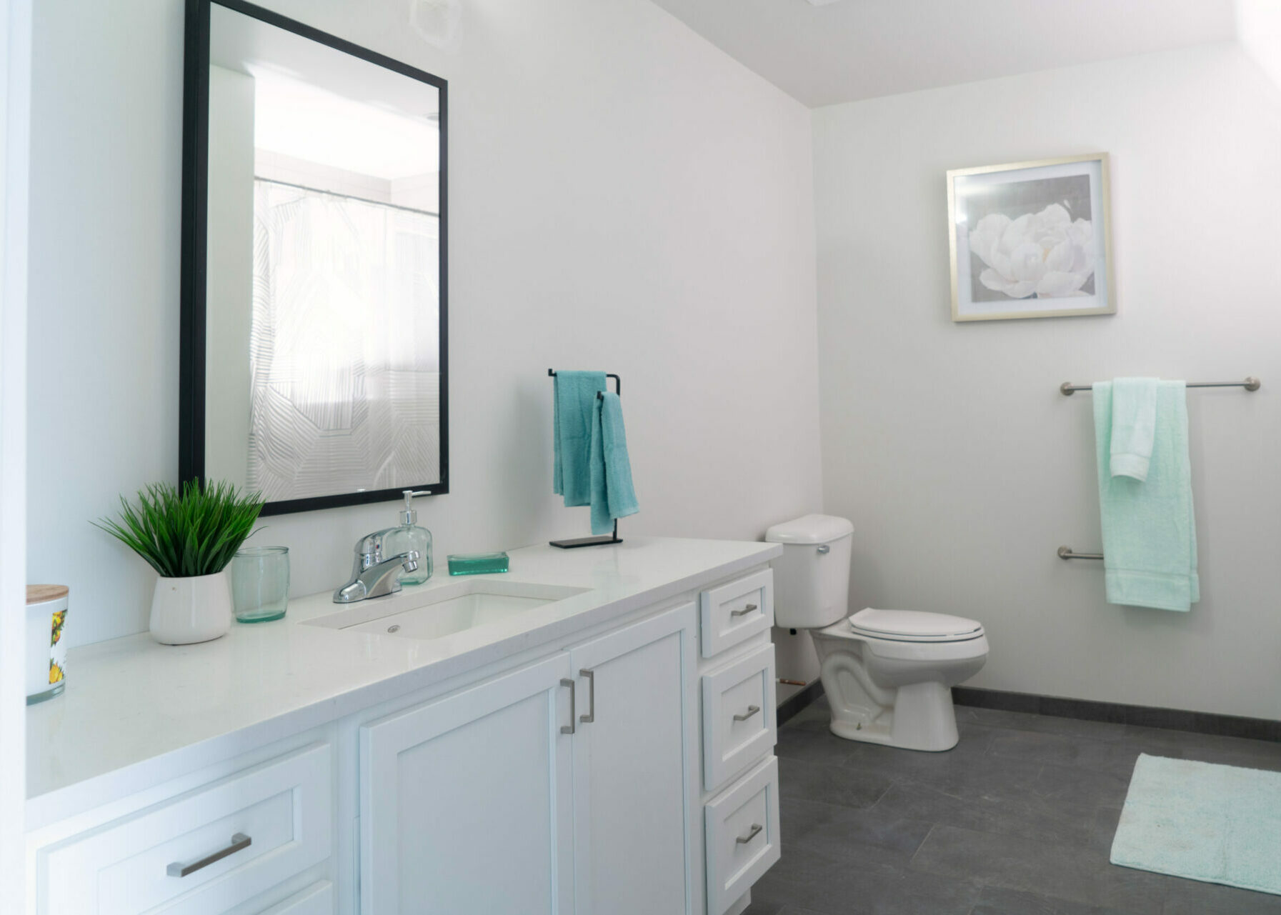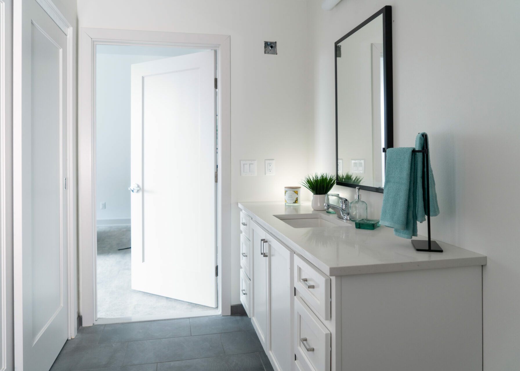 - Tile floors in bathrooms